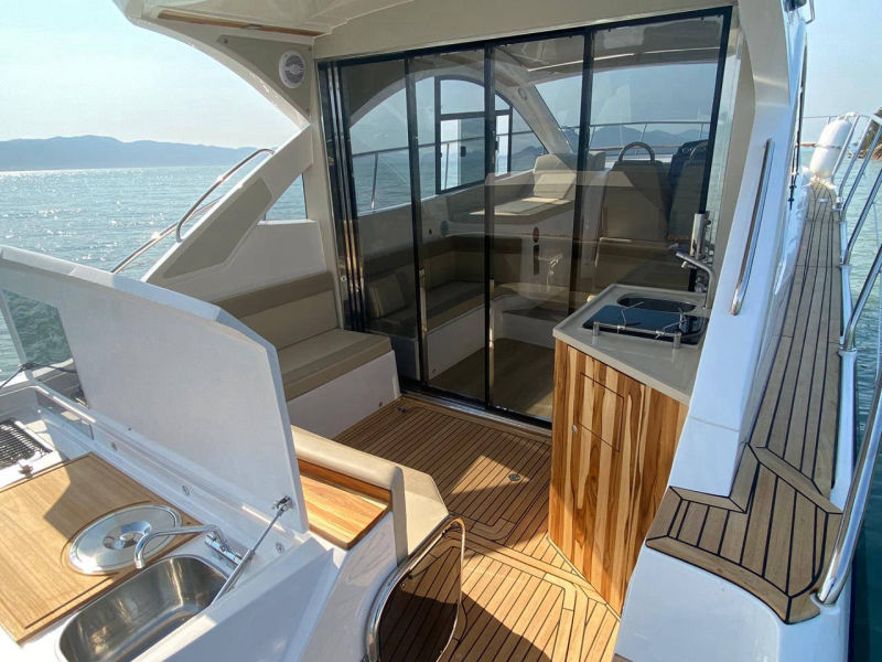 | Gourmet space in cockpit with refrigerator, hand-made solid tropical hardwood cabinet with quartz stone top and latest design faucet and sink | All upholstery made with anti-mould material |