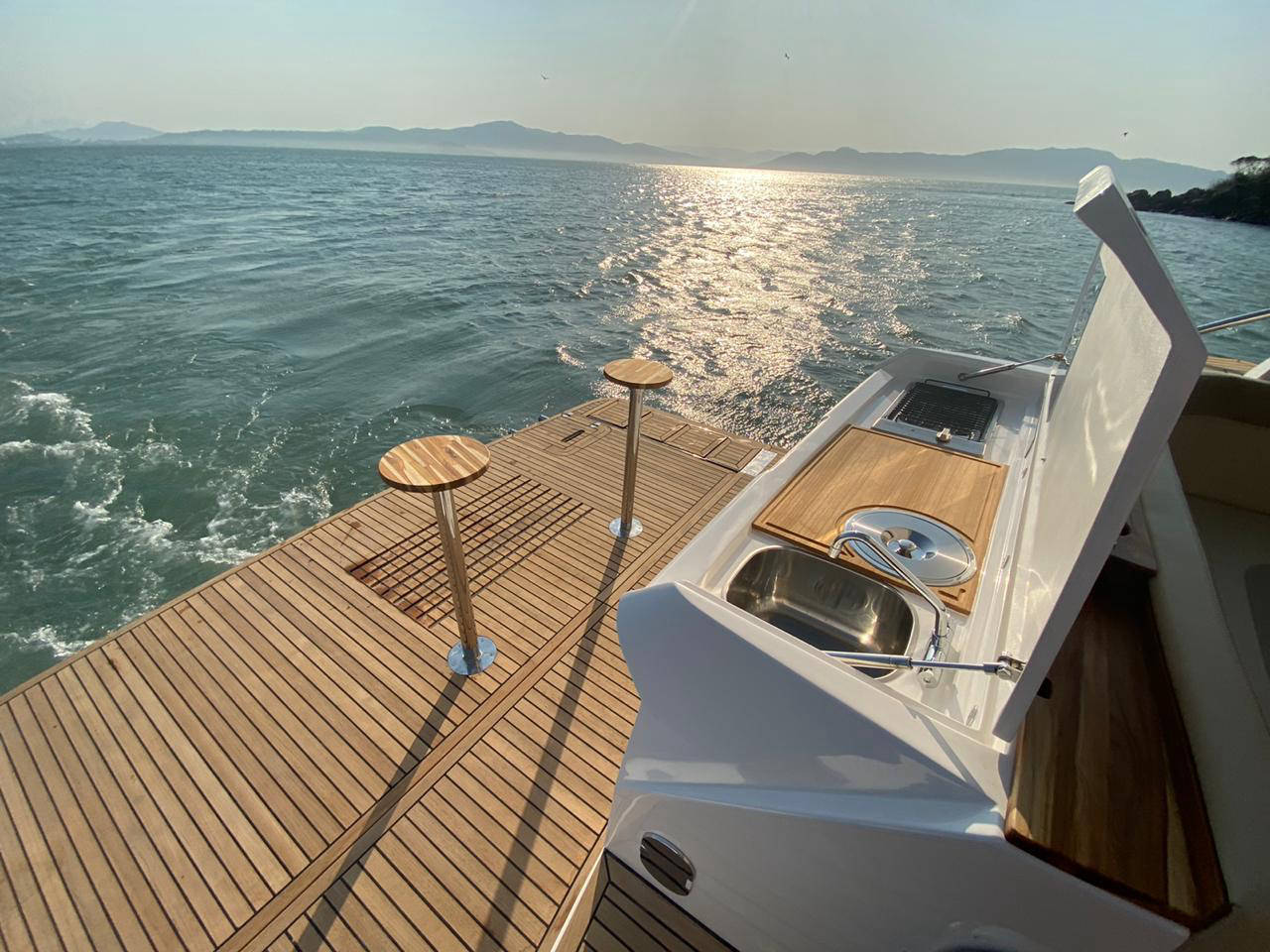 | Four step retractable ladder on swim platform | Gourmet space on swim platform with sink, faucet, chopping board and lateral support for extra chopping board |